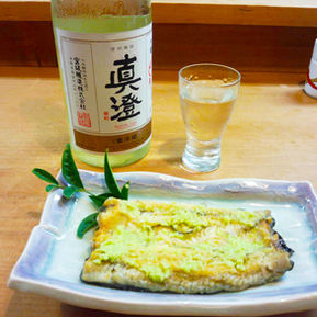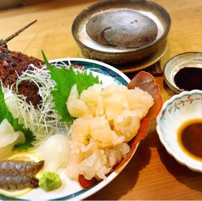冬季のおすすめは、ふぐ。調理場にある水槽で活かした新鮮な2Kg以上ある大きなふぐを丁寧に調理しております。皮は愛媛の名物「ざく」でお召し上がりいただけます。ひれ酒もございます。写真は、ふぐのテッサです。